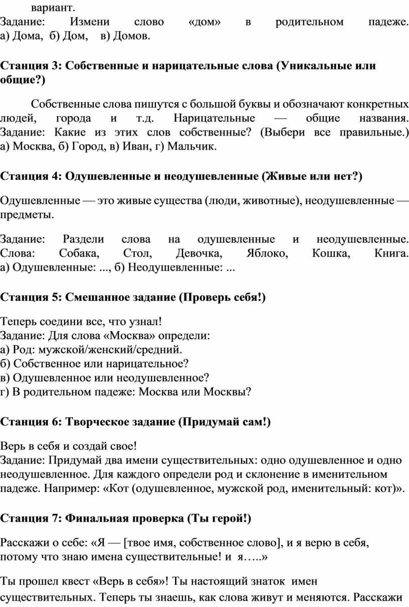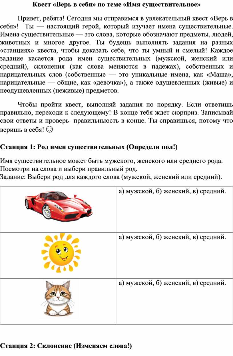 Привет, ребята! Сегодня мы отправимся в увлекательный квест «Верь в себя»! Ты — настоящий герой, который изучает имена существительные. Имена существительные — это слова, которые обозначают предметы, людей, животных и многое другое. Ты будешь выполнять задания на разных «станциях» квеста, чтобы доказать себе, что ты умный и смелый! Каждое задание касается рода имен существительных (мужской, женский или средний), склонения (как слова меняются в падежах), собственных и нарицательных слов (собственные — это уникальные имена, как «Маша», нарицательные — общие, как «девочка»), а также одушевленных (живые) и неодушевленных (неживые) предметов.