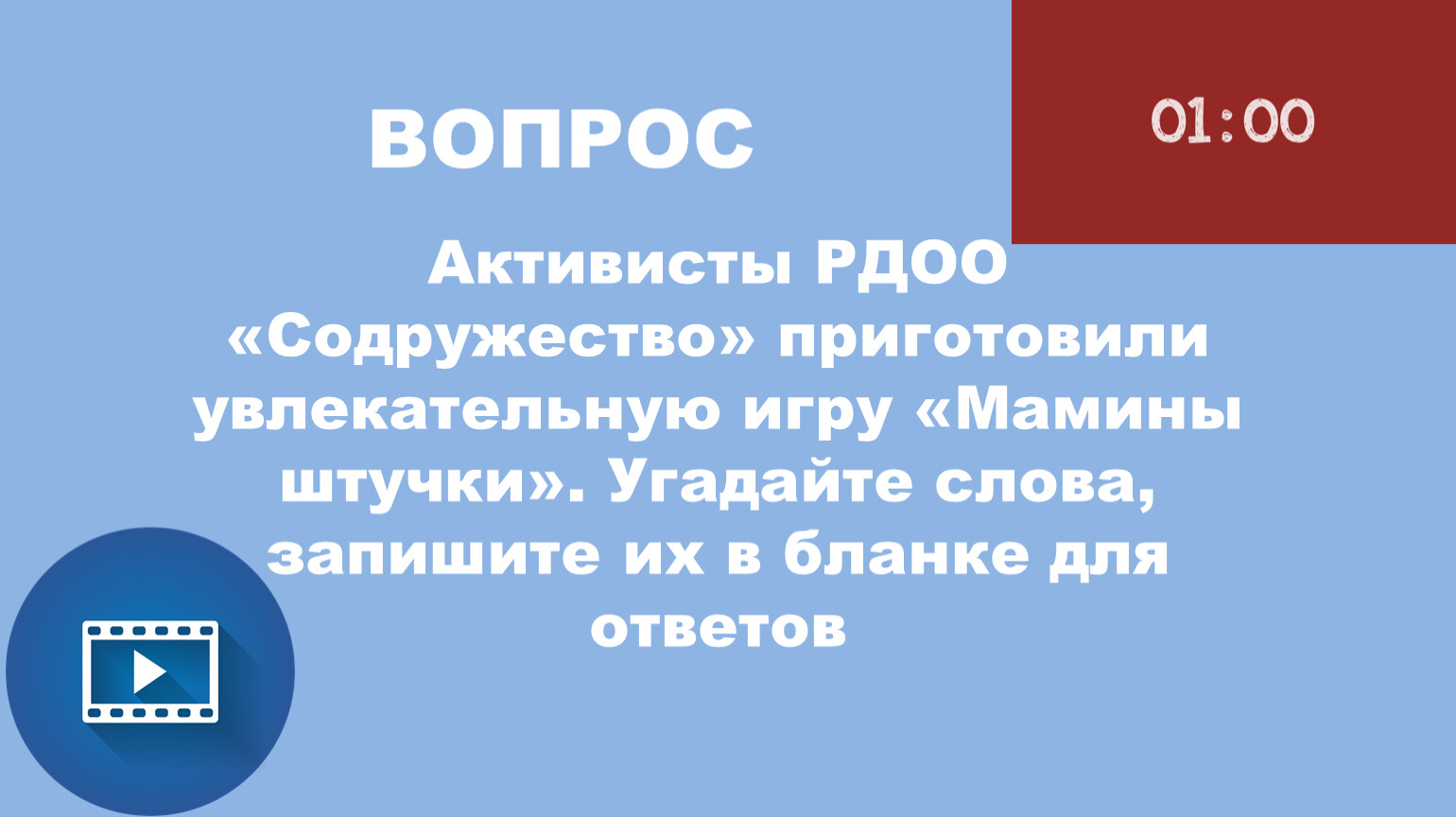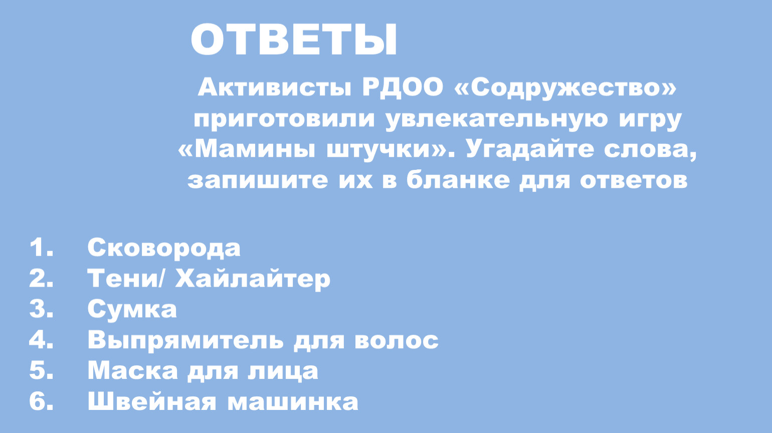 Активисты РДОО «Содружество» приготовили увлекательную игру «Мамины штучки». Угадайте слова, запишите их в бланке для ответов