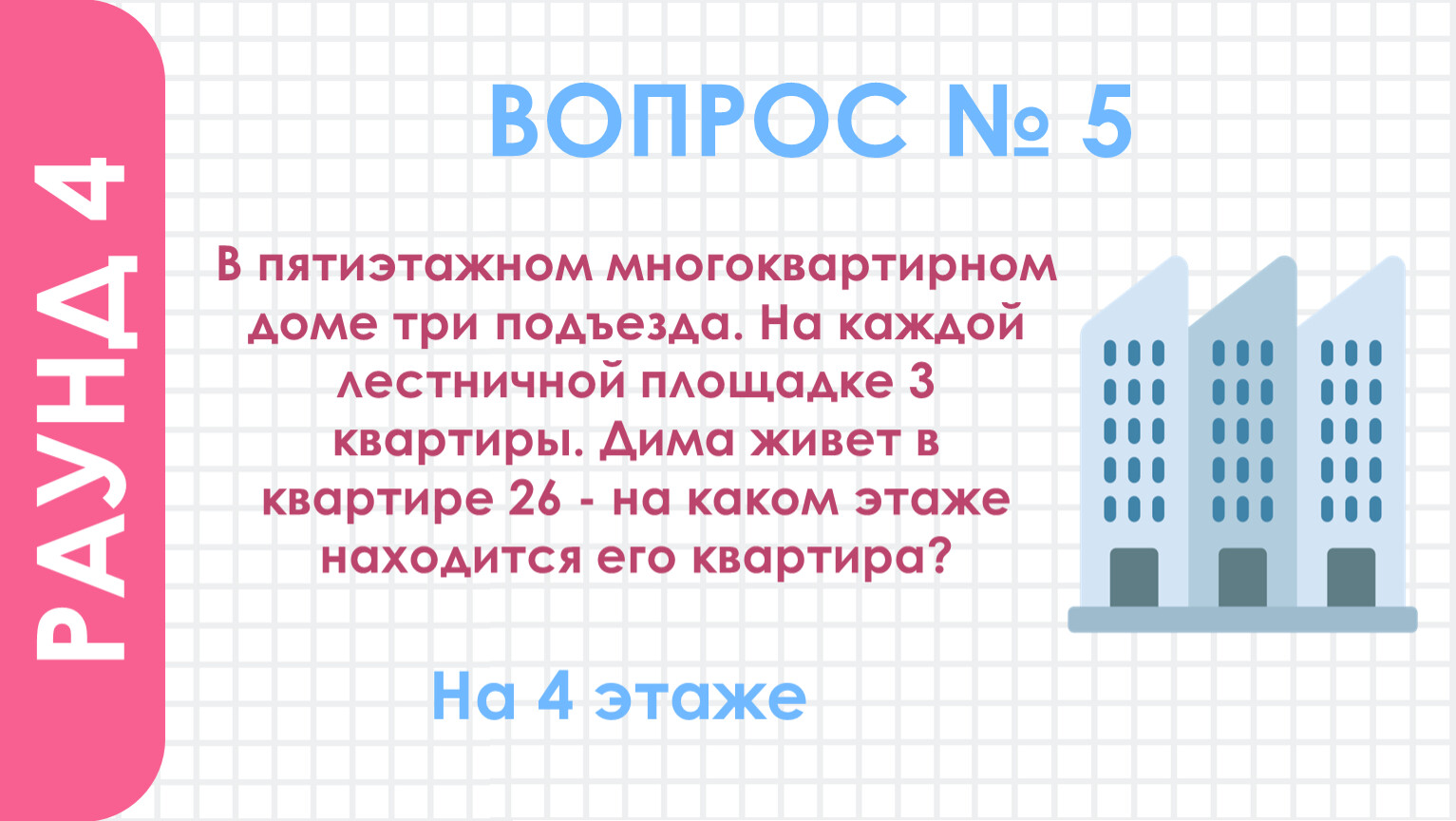 В пятиэтажном многоквартирном доме три подъезда. На каждой лестничной площадке 3 квартиры. Дима живет в квартире 26 - на каком этаже находится его квартира?