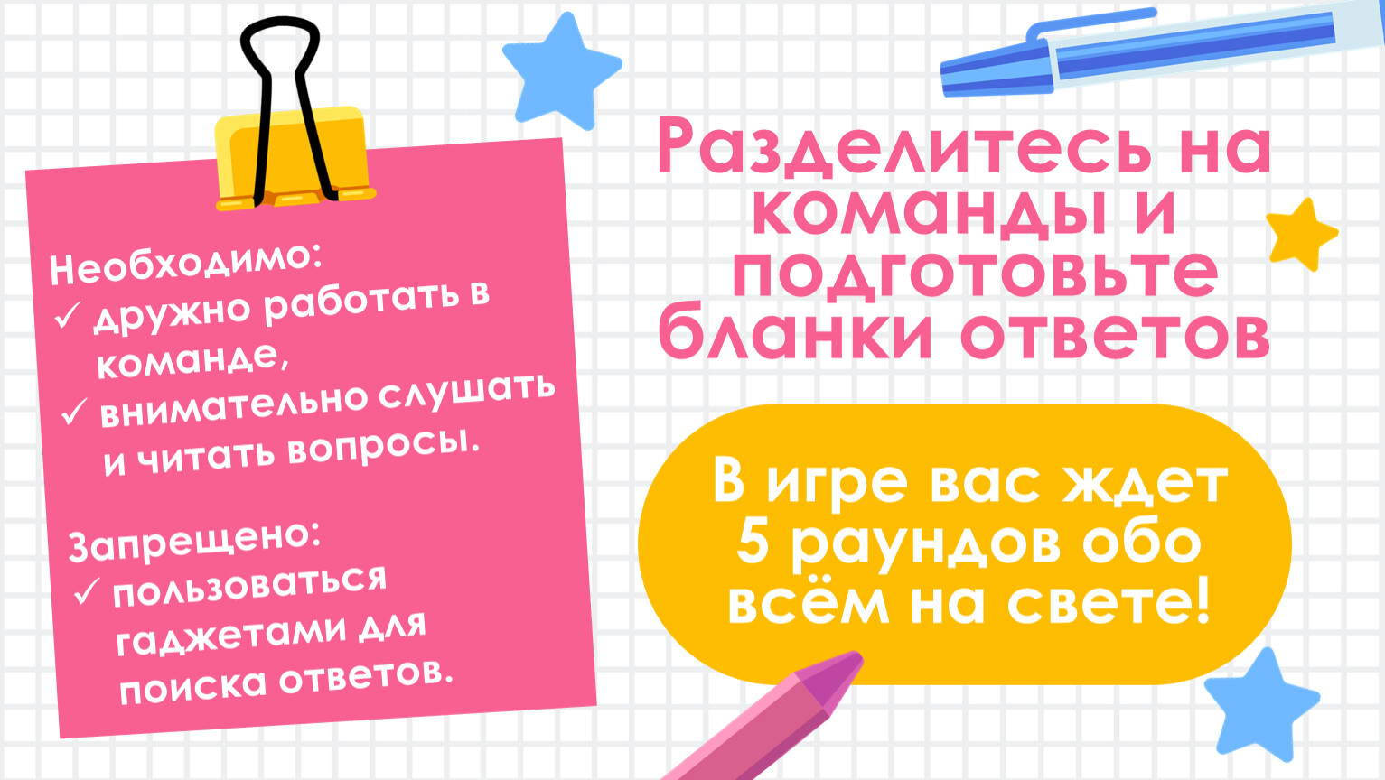 В игре вас ждет 5 раундов обо всём на свете!