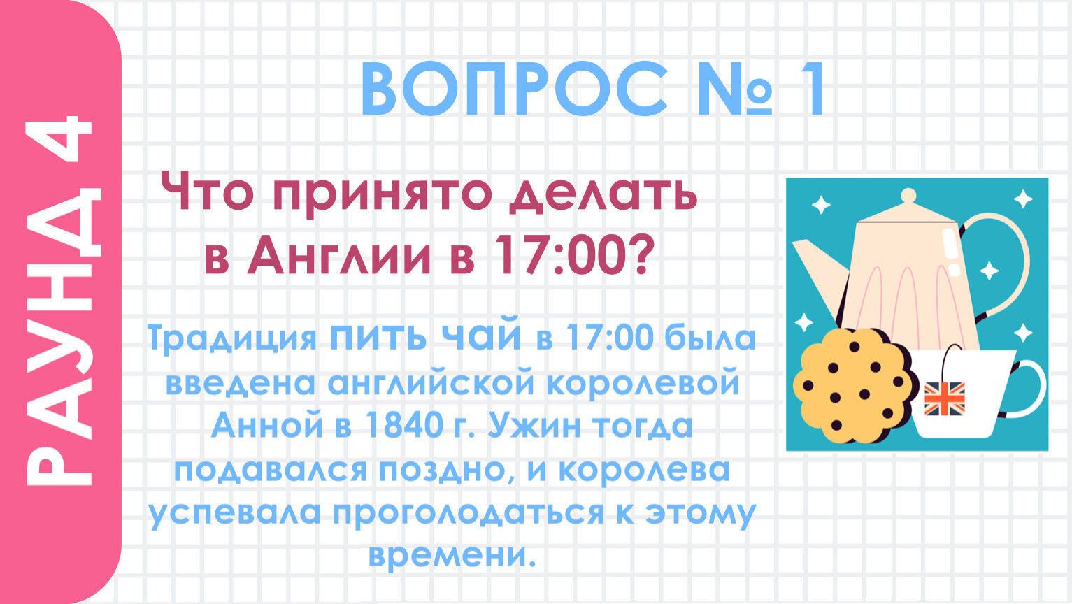 Традиция пить чай в 17:00 была введена английской королевой Анной в 1840 г. Ужин тогда подавался поздно, и королева успевала проголодаться к этому времени.