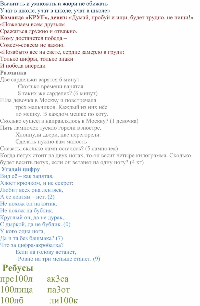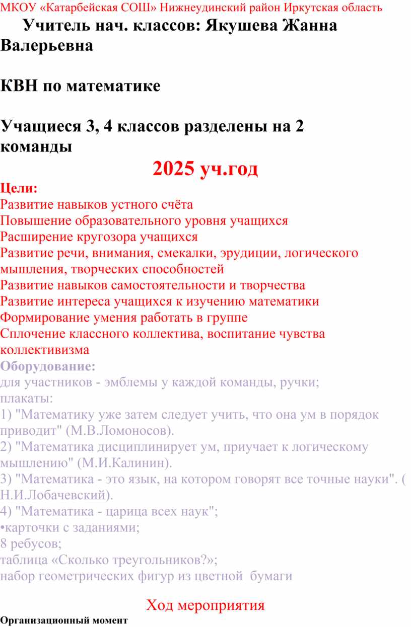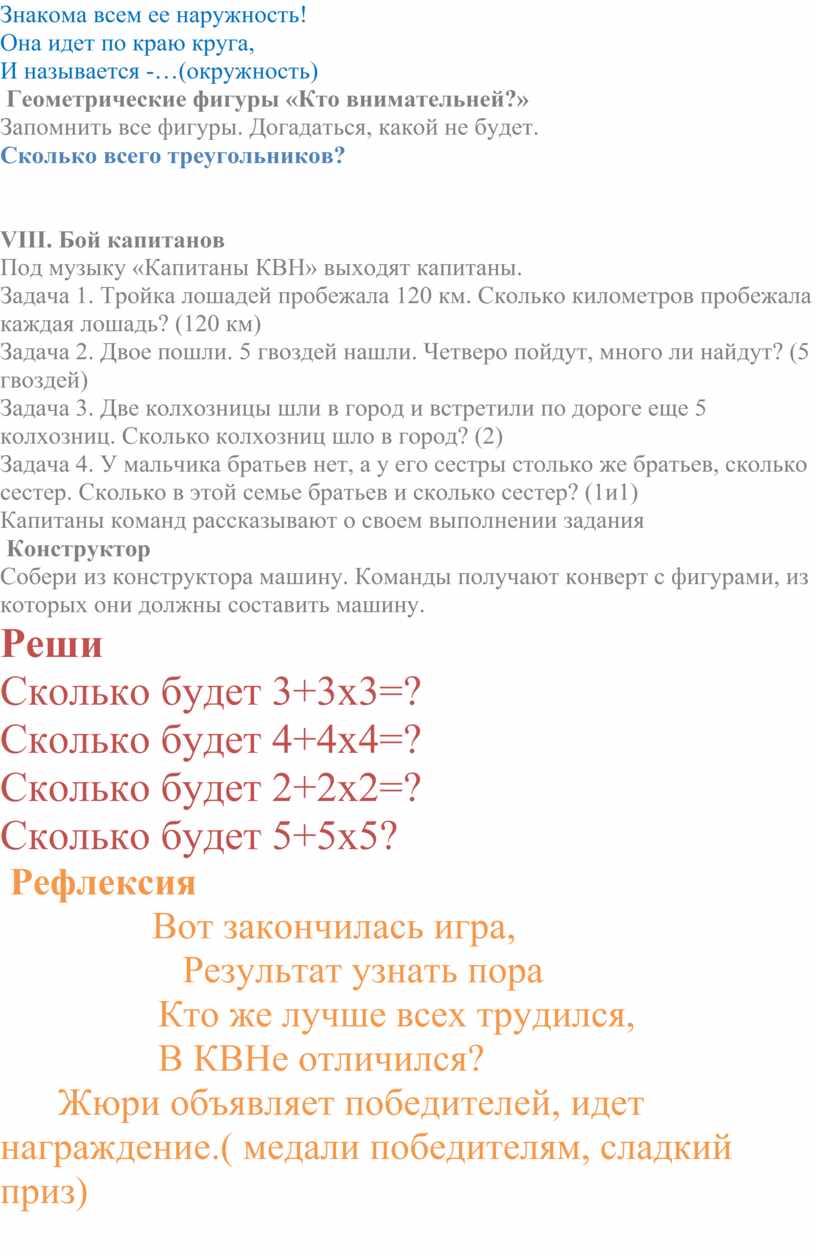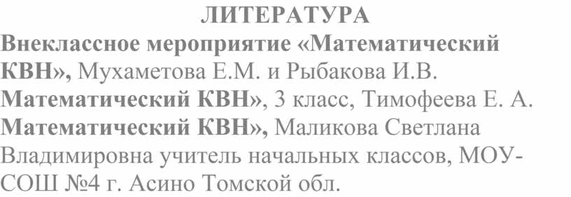 Математический КВН», Маликова Светлана Владимировна учитель начальных классов, МОУ-СОШ №4 г. Асино Томской обл.