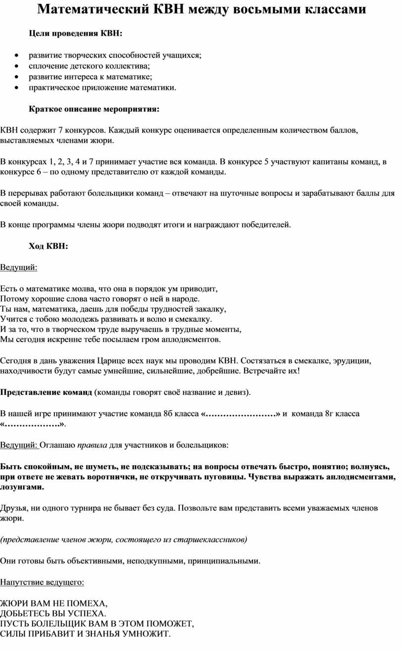 В нашей игре принимают участие команда 8б класса «……………………» и команда 8г класса «……………….».