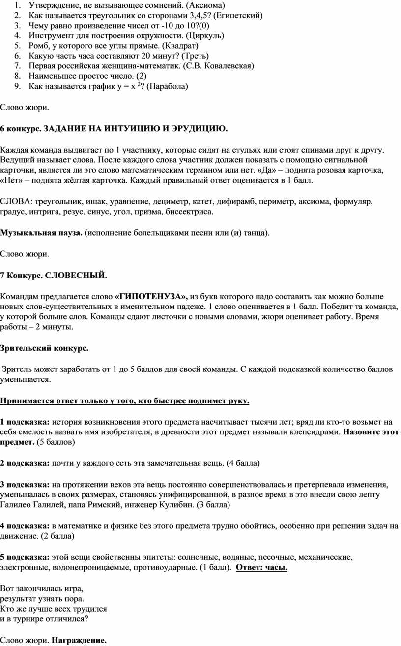 Командам предлагается слово «ГИПОТЕНУЗА», из букв которого надо составить как можно больше новых слов-существительных в именительном падеже. 1 слово оценивается в 1 балл. Победит та команда, у которой больше слов. Команды сдают листочки с новыми словами, жюри оценивает работу. Время работы – 2 минуты.