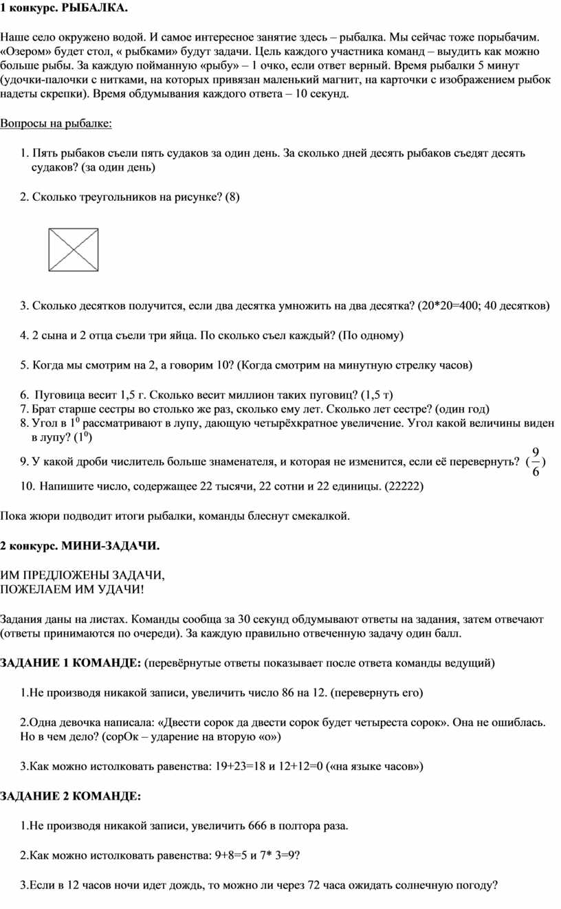 Наше село окружено водой. И самое интересное занятие здесь – рыбалка. Мы сейчас тоже порыбачим. «Озером» будет стол, « рыбками» будут задачи. Цель каждого участника команд – выудить как можно больше рыбы. За каждую пойманную «рыбу» – 1 очко, если ответ верный. Время рыбалки 5 минут (удочки-палочки с нитками, на которых привязан маленький магнит, на карточки с изображением рыбок надеты скрепки). Время обдумывания каждого ответа – 10 секунд.