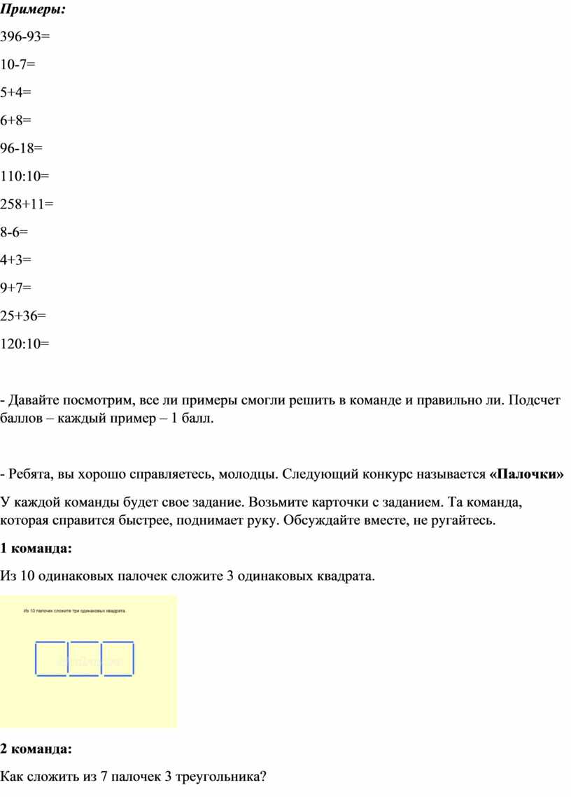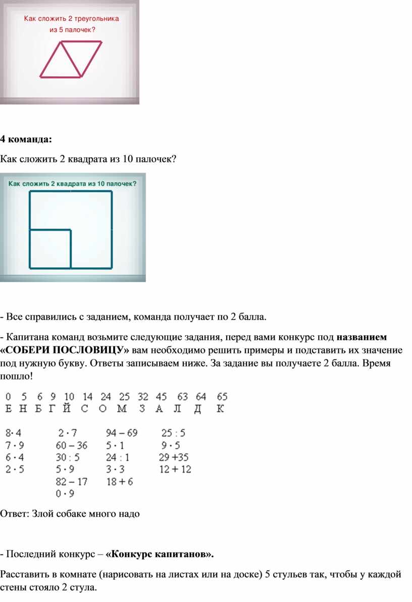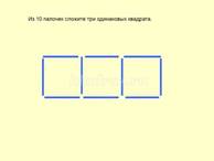 - Ребята, вы хорошо справляетесь, молодцы. Следующий конкурс называется «Палочки» У каждой команды будет свое задание. Возьмите карточки с заданием. Та команда, которая справится быстрее, поднимает руку. Обсуждайте вместе, не ругайтесь. 1 команда: Из 10 одинаковых палочек сложите 3 одинаковых квадрата.