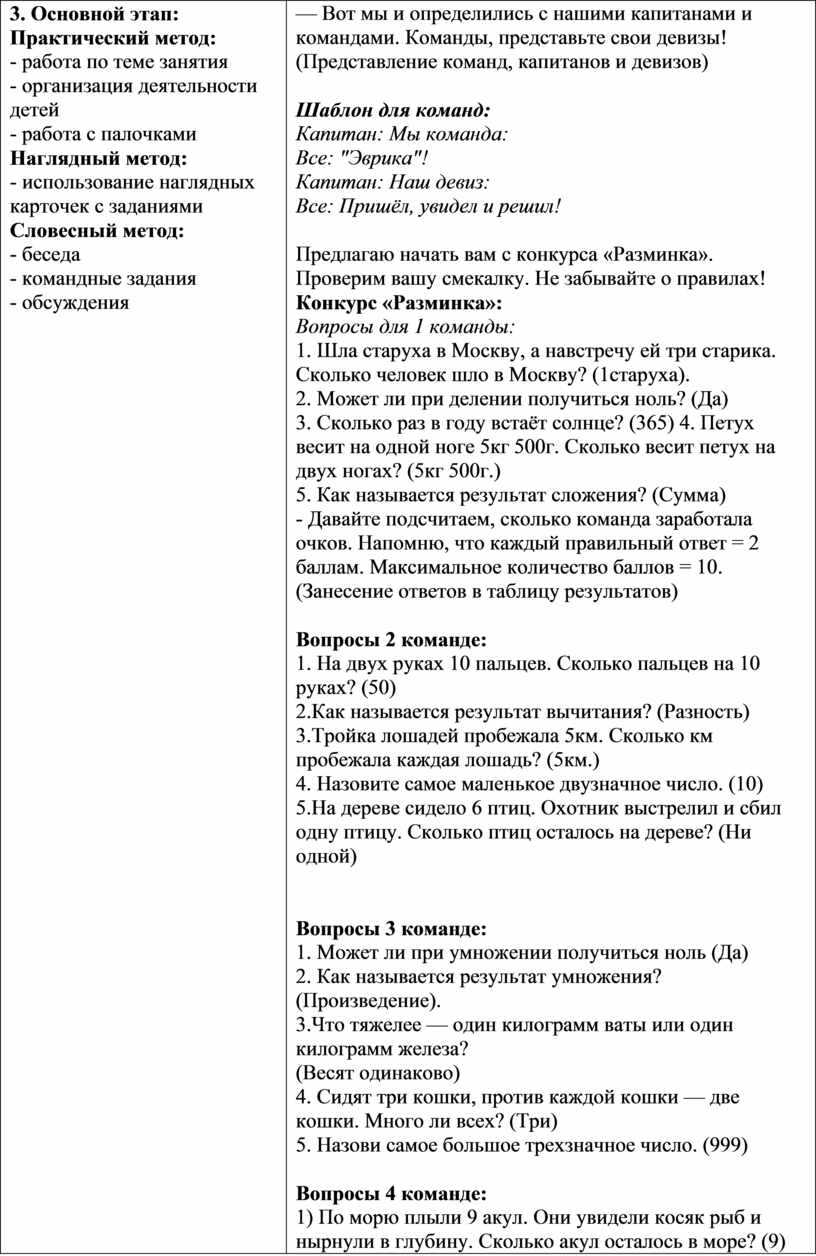 3. Основной этап: Практический метод: - работа по теме занятия - организация деятельности детей - работа с палочками Наглядный метод: - использование наглядных карточек с заданиями Словесный метод: - беседа - командные задания - обсуждения