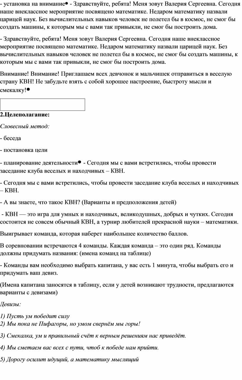 - Здравствуйте, ребята! Меня зовут Валерия Сергеевна. Сегодня наше внеклассное мероприятие посвящено математике. Недаром математику назвали царицей наук. Без вычислительных навыков человек не полетел бы в космос, не смог бы создать машины, к которым мы с вами так привыкли, не смог бы построить дома. Внимание! Внимание! Приглашаем всех девчонок и мальчишек отправиться в веселую страну КВН! Не забудьте взять с собой хорошее настроение, быстроту мысли и смекалку! |