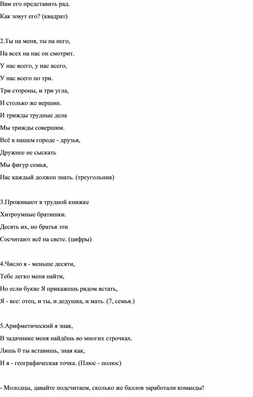 - Следующий конкурс называется «Отгадай ребус». Числа любят прятаться между буквами и вместе с ними составлять слова. А вот в какие слова попали числа, вы узнаете, если разгадаете 5 ребусов. Максимальное количество баллов – 2. Та команда, которая справится с заданием быстрее, получает дополнительный балл. *Карточка выдаются каждой команде