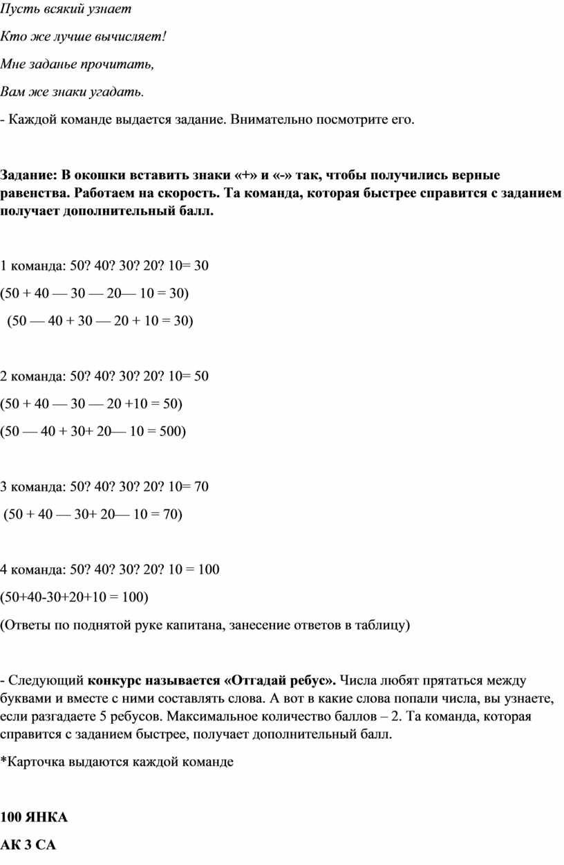 4 команда: 50? 40? 30? 20? 10 = 100 (50+40-30+20+10 = 100) (Ответы по поднятой руке капитана, занесение ответов в таблицу)