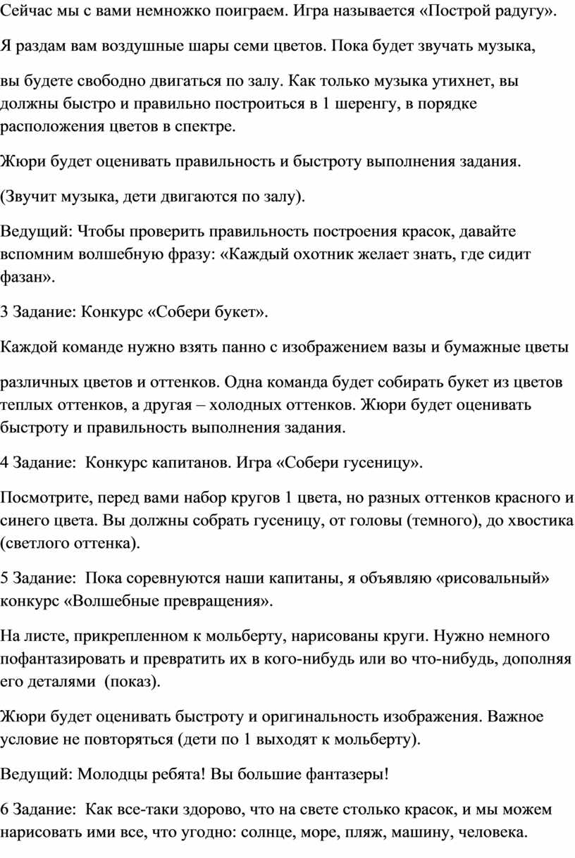 Материал: кроссворд; эмблемы команд; дидактическая игра «Составь букет», «Собери гусеницу»; 2 бумажные палитры; цветовые фишки; 2 набора открыток с репродукциями в разных изобразительных жанрах; 2 листа бумаги с нарисованными кругами для игры «Превращение»; маркеры; медальоны «Знатоку ИЗО» на каждого участника; палитры; гуашь; кисти № 3, 8; альбомные листы на каждого; мольберты; воздушные шары для оформления зала и 2 набора шаров 7 цветов спектра.