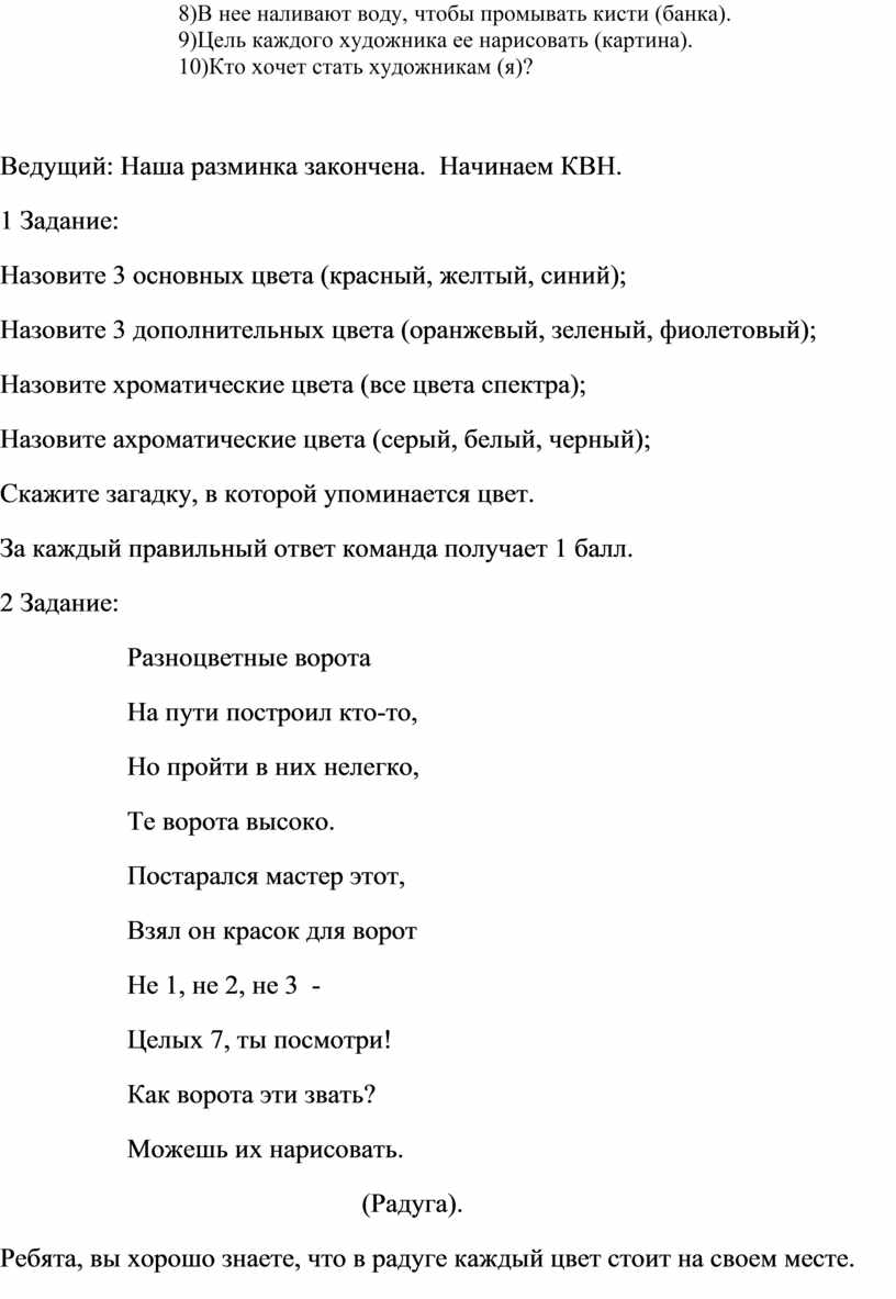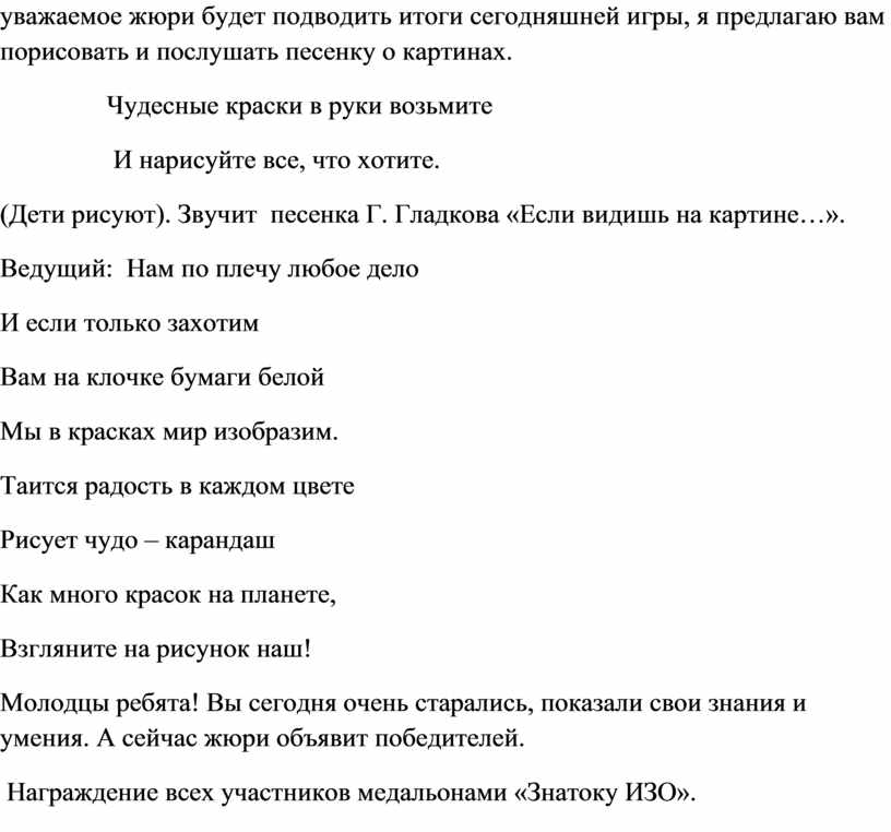 Ведущий: Дорогие ребята, это был последний конкурс нашего КВН. Пока уважаемое жюри будет подводить итоги сегодняшней игры, я предлагаю вам порисовать и послушать песенку о картинах.