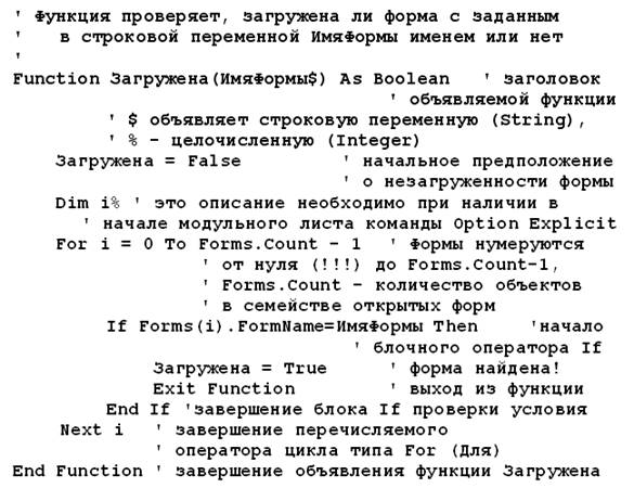 Создайте новый модуль Реализация и дополните его приведённой ниже логической функцией Загружена. Она проверяет, загружена ли форма с заданным именем. В Access-97/2000 в имени функции используйте только латинские буквы, например: IsLoaded.