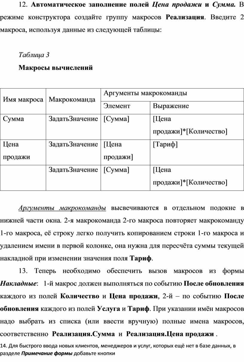 12. Автоматическое заполнение полей Цена продажи и Сумма. В режиме конструктора создайте группу макросов Реализация. Введите 2 макроса, используя данные из следующей таблицы: