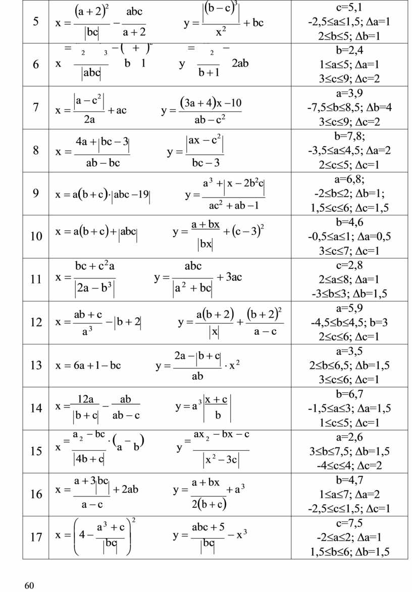 Исходные данные: ан, ак, ∆а, сн, ск, ∆с, b. Промежуточные данные: значения Х. Результат вычислений: значения Y.