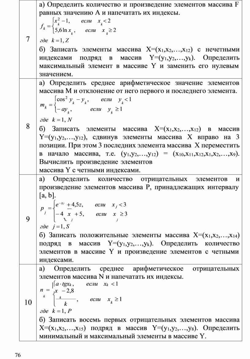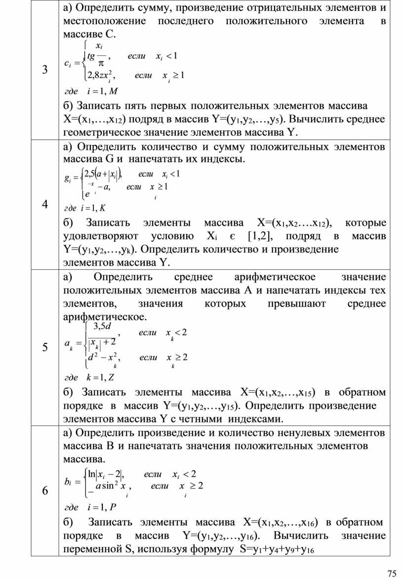 а) Определить количество и сумму отрицательных элементов массива С и напечатать индексы первого и последнего отрицательного элемента. ì 1 c = ïb - x , если xk ³ 3 k í k ï- b3 cos 2 x , если x < 3 î k k где k = 1, P б) Записать элементы массива Х=(х1,х2,…,х16), которые удовлетворяют условию Xi<3 подряд в массив Y=(у1,у2,…,уk). Определить произведение элементов с четными индексами в массиве Y. |