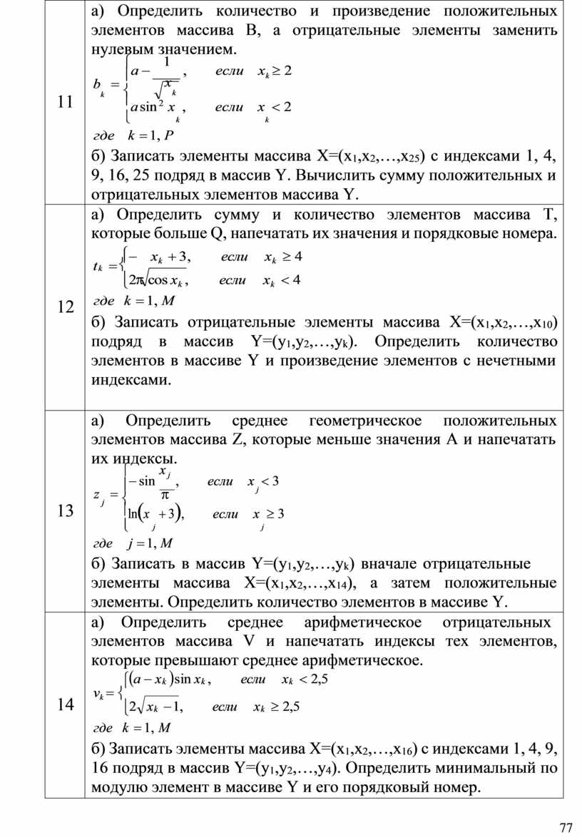 z = ï p j j í ïln(x + 3), если x ³ 3 î j j где j = 1, M б) Записать в массив Y=(у1,у2,…,уk) вначале отрицательные элементы массива Х=(х1,х2,…,х14), а затем положительные элементы. Определить количество элементов в массиве Y. |