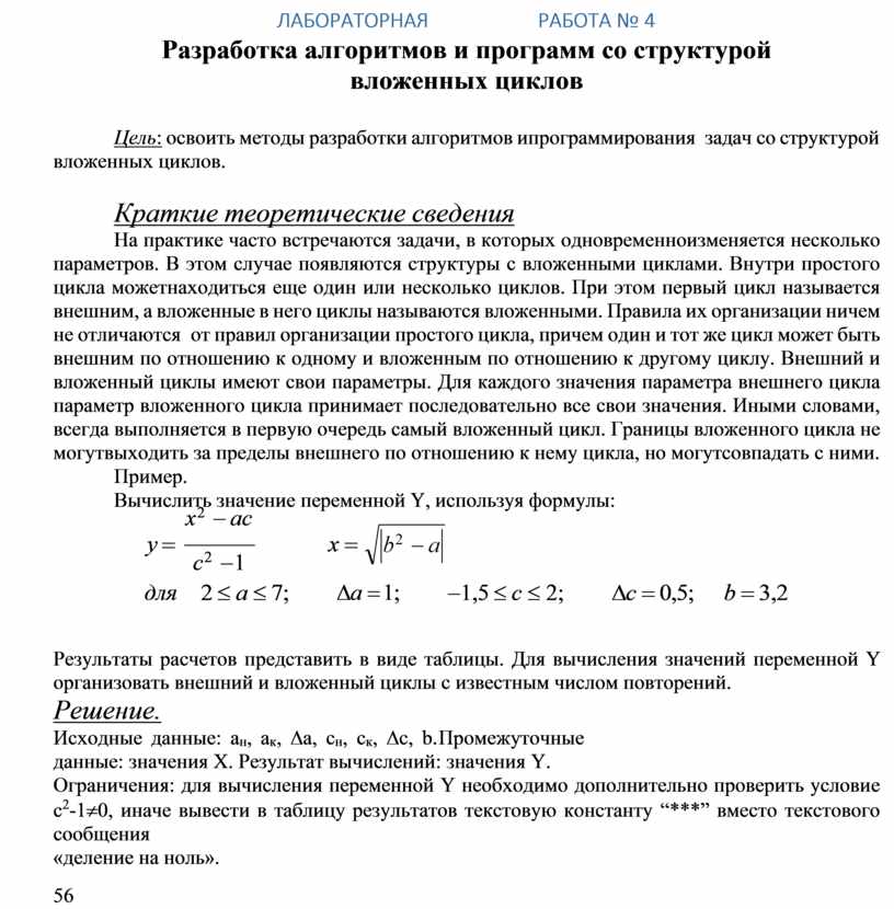 Цель: освоить методы разработки алгоритмов и программирования задач со структурой вложенных циклов.