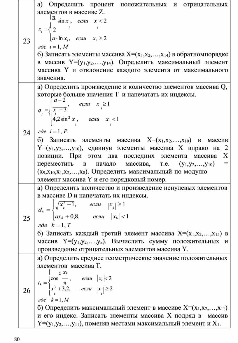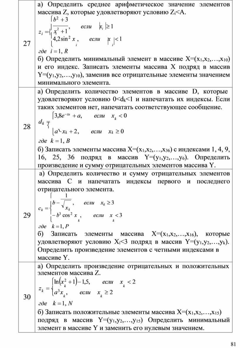 а) Определить сумму квадратов отрицательных элементов и произведение положительных элементов массива C. ìsin xi , если xi < 2 c = ï x i í i ï3,7 cos p , если xi ³ 2 î где i = 1, M б) Записать элементы массива Х=(х1,х2,…,х15) в массив Y=(у1,у2,…,у15), сдвинув элементы массива Х влево на 4 позиции. При этом первые 4 элемента массива Х переставить в конец массива, т.е. (у1,у2,…,у15) = (х5,х6,…,х15,х1,х2,х3,х4). Вычислить сумму элементов массива Y с нечетными индексами. |