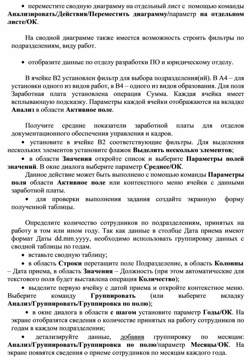 В ячейке В2 установлен фильтр для выбора подразделения(ий). В А4 – для установки одного из видов работ, в В4 – одного из видов образования. Для поля Заработная плата установлена операция Сумма. Каждая ячейка имеет всплывающую подсказку. Параметры каждой ячейки отображаются на вкладке Анализ в области Активное поле.