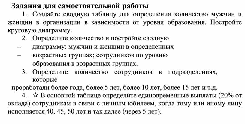 1. Создайте сводную таблицу для определения количество мужчин и женщин в организации в зависимости от уровня образования. Постройте круговую диаграмму.