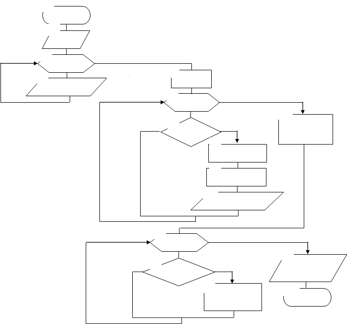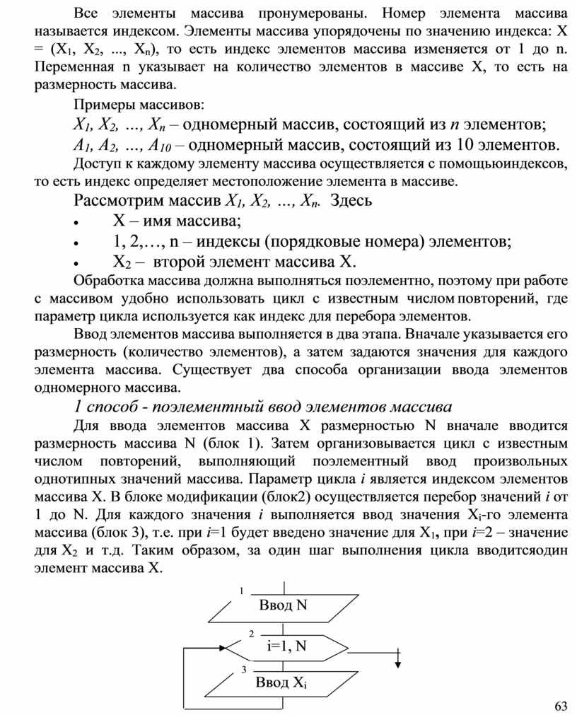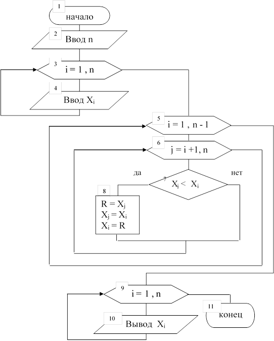 Для ввода элементов массива Х размерностью N вначале вводится размерность массива N (блок 1). Затем организовывается цикл с известным числом повторений, выполняющий поэлементный ввод произвольных однотипных значений массива. Параметр цикла i является индексом элементов массива Х. В блоке модификации (блок 2) осуществляется перебор значений i от 1 до N. Для каждого значения i выполняется ввод значения Хi-го элемента массива (блок 3), т.е. при i=1 будет введено значение для X1, при i=2 – значение для X2 и т.д. Таким образом, за один шаг выполнения цикла вводится один элемент массива Х.