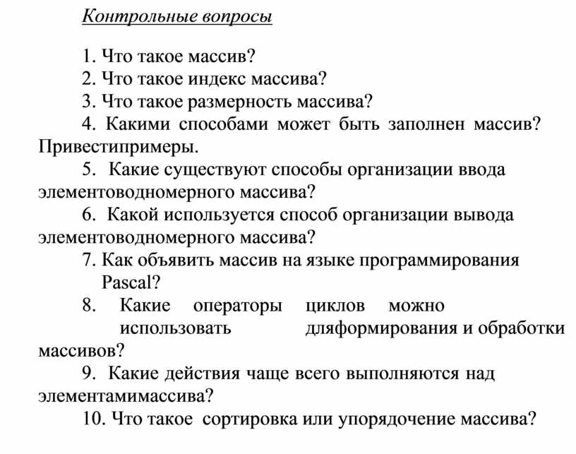 Все элементы массива пронумерованы. Номер элемента массива называется индексом. Элементы массива упорядочены по значению индекса: Х = (Х1, Х2, ..., Хn), то есть индекс элементов массива изменяется от 1 до n. Переменная n указывает на количество элементов в массиве Х, то есть на размерность массива.