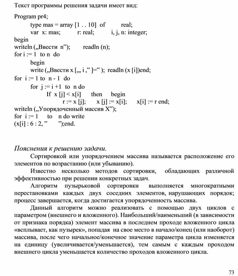 Данный алгоритм можно реализовать с помощью двух циклов с параметром (внешнего и вложенного). Наибольший/наименьший (в зависимости от признака порядка) элемент массива в последнем проходе вложенного цикла «всплывает, как пузырек», попадая на свое место в начало/конец (или наоборот) массива, после чего начальное/конечное значение параметра цикла изменяется на единицу (увеличивается/уменьшается), тем самым с каждым проходом внешнего цикла уменьшается количество проходов вложенного цикла.