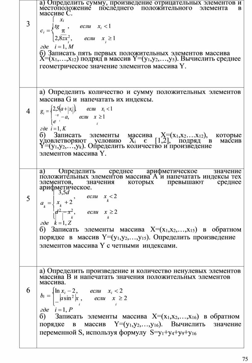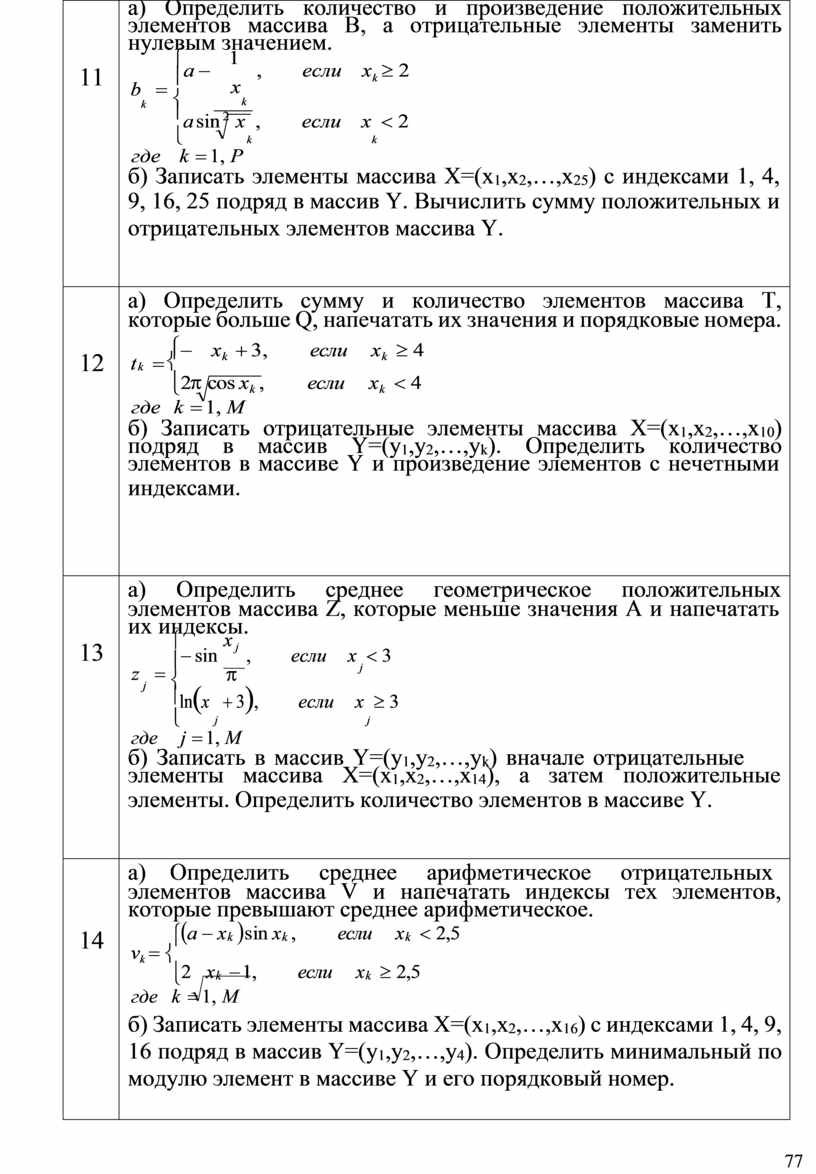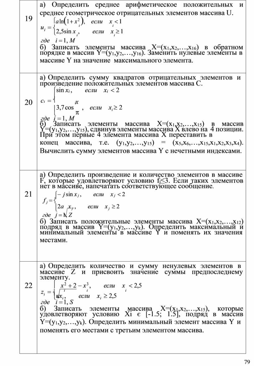 а) Определить сумму квадратов отрицательных элементов и произведение положительных элементов массива C. ìsin xi , если xi < 2 c = ï x i í i ï3,7 cos p , если xi ³ 2 î где i = 1, M б) Записать элементы массива Х=(х1,х2,…,х15) в массив Y=(у1,у2,…,у15), сдвинув элементы массива Х влево на 4 позиции. При этом первые 4 элемента массива Х переставить в конец массива, т.е. (у1,у2,…,у15) = (х5,х6,…,х15,х1,х2,х3,х4). Вычислить сумму элементов массива Y с нечетными индексами. |