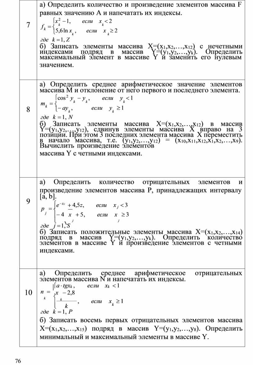а) Определить количество и сумму отрицательных элементов массива С и напечатать индексы первого и последнего отрицательного элемента. ì 1 c = ïb - x , если xk ³ 3 k í k ï- b3 cos 2 x , если x < 3 î k k где k = 1, P б) Записать элементы массива Х=(х1,х2,…,х16), которые удовлетворяют условию Xi<3 подряд в массив Y=(у1,у2,…,уk). Определить произведение элементов с четными индексами в массиве Y. |