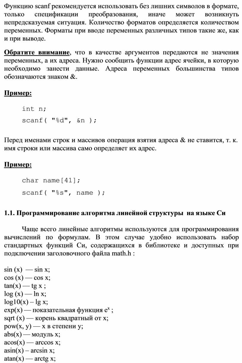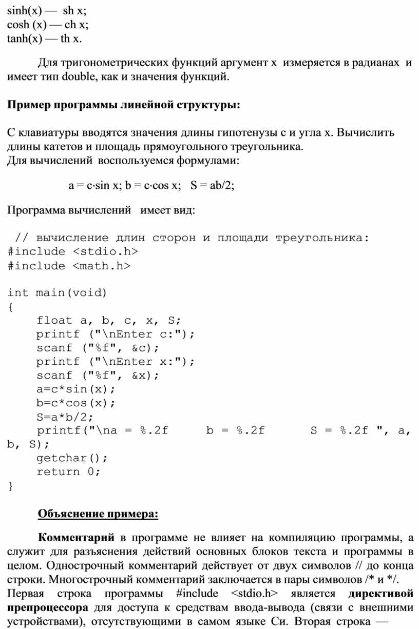 Чаще всего линейные алгоритмы используются для программирования вычислений по формулам. В этом случае удобно использовать набор стандартных функций Си, содержащихся в библиотеке и доступных при подключении заголовочного файла math.h :