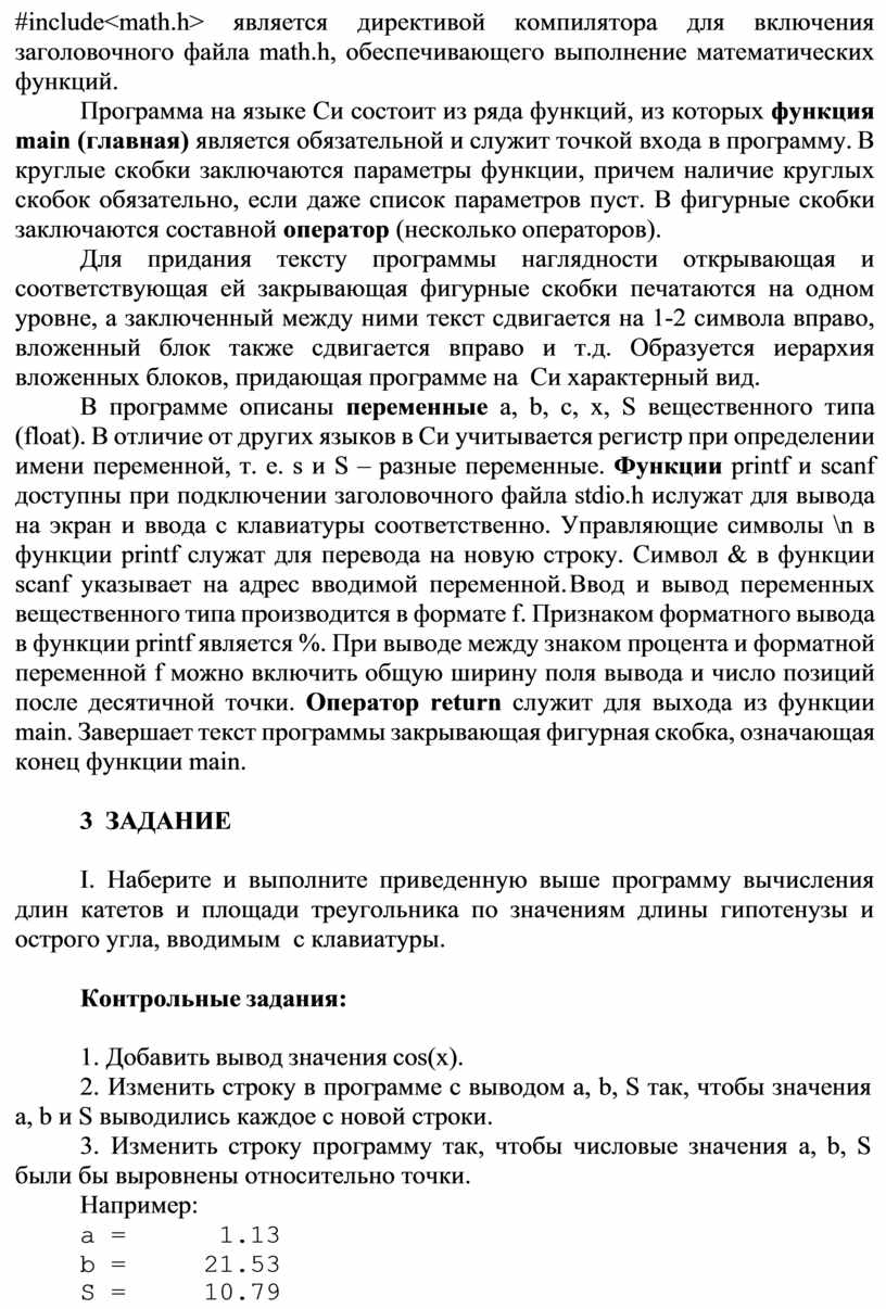 I. Наберите и выполните приведенную выше программу вычисления длин катетов и площади треугольника по значениям длины гипотенузы и острого угла, вводимым с клавиатуры.