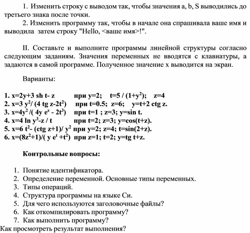 II. Составьте и выполните программы линейной структуры согласно следующим заданиям. Значения переменных не вводятся с клавиатуры, а задаются в самой программе. Полученное значение x выводится на экран.
