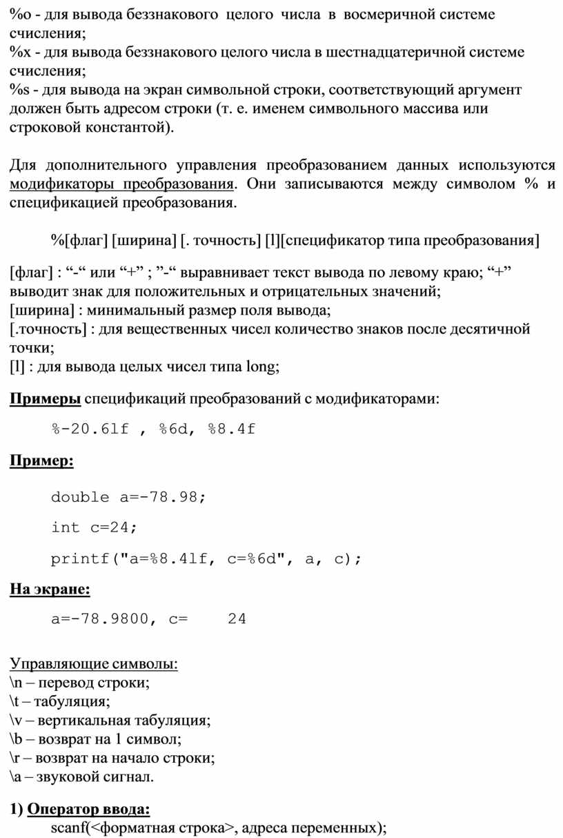 Для дополнительного управления преобразованием данных используются модификаторы преобразования. Они записываются между символом % и спецификацией преобразования.