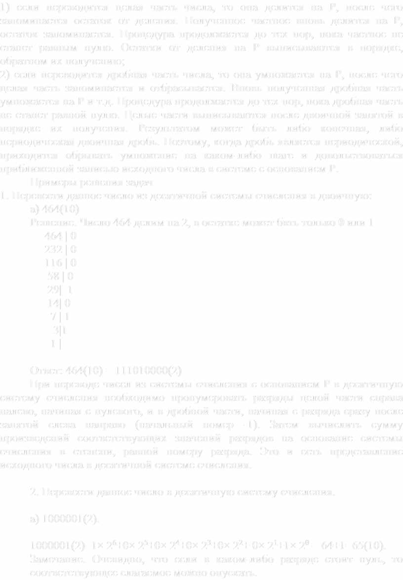 1) если переводится целая часть числа, то она делится на P, после чего запоминается остаток от деления. Полученное частное вновь делится на P, остаток запоминается. Процедура продолжается до тех пор, пока частное не станет равным нулю. Остатки от деления на P выписываются в порядке, обратном их получению;