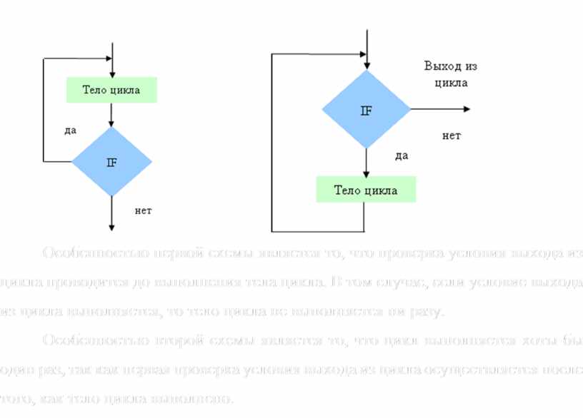 Особенностью первой схемы является то, что проверка условия выхода из цикла проводится до выполнения тела цикла. В том случае, если условие выхода из цикла выполняется, то тело цикла не выполняется ни разу.