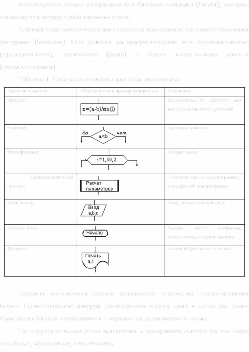 Таблица 1. Основные символы для схем алгоритмов