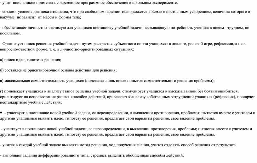 - учит школьников применять современное программное обеспечение в школьном эксперименте. - создает условия для доказательства, что при свободном падении тело движется к Земле с постоянным ускорением, величина которого в вакууме не зависит от массы и формы тела; - обеспечивает личностно значимую для учащихся постановку учебной задачи, вызывающую потребность ученика в новом - трудном, но посильном. - Организует поиск решения учебной задачи путем раскрытия субъектного опыта учащихся: в диалоге, ролевой игре, рефлексии, а не в вопросно-ответной форме, т. е. в личностно-ориентированных ситуациях: а) поиск идеи, гипотезы решения; б) составление ориентировочной основы действий для решения; в) максимальная самостоятельность учащихся (подсказка лишь после попыток самостоятельного решения проблемы); г) привлекает учащихся к анализу этапов решения учебной задачи, стимулирует учащихся к высказываниям без боязни ошибиться, ориентирует на использование разных способов действий, привлекает к анализу собственных затруднений учащихся (рефлексия), поощряет нестандартные учебные действия; |