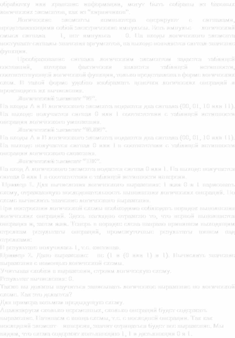 Логические элементы компьютера оперируют с сигналами, представляющими собой электрические импульсы. Есть импульс — логический смысл сигнала — 1, нет импульса — 0. На входы логического элемента поступают сигналы-значения аргументов, на выходе появляется сигнал-значение функции.