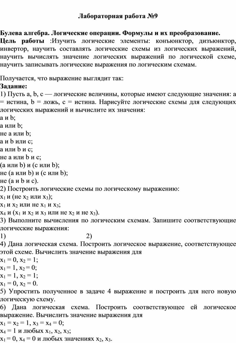 1) Пусть а, b, с — логические величины, которые имеют следующие значения: а = истина, b = ложь, с = истина. Нарисуйте логические схемы для следующих логических выражений и вычислите их значения: