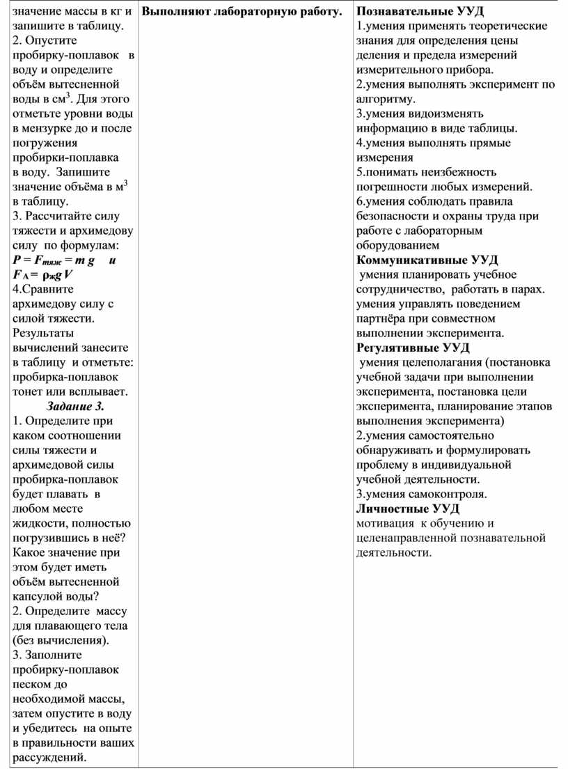 Познавательные УУД 1.умения применять теоретические знания для определения цены деления и предела измерений измерительного прибора. 2.умения выполнять эксперимент по алгоритму. 3.умения видоизменять информацию в виде таблицы. 4.умения выполнять прямые измерения 5.понимать неизбежность погрешности любых измерений. 6.умения соблюдать правила безопасности и охраны труда при работе с лабораторным оборудованием Коммуникативные УУД 1. умения планировать учебное сотрудничество, работать в парах. 2.умения управлять поведением партнёра при совместном выполнении эксперимента. Регулятивные УУД 1. умения целеполагания (постановка учебной задачи при выполнении эксперимента, постановка цели эксперимента, планирование этапов выполнения эксперимента) 2.умения самостоятельно обнаруживать и формулировать проблему в индивидуальной учебной деятельности. 3.умения самоконтроля. Личностные УУД 1.мотивация к обучению и целенаправленной познавательной деятельности. |