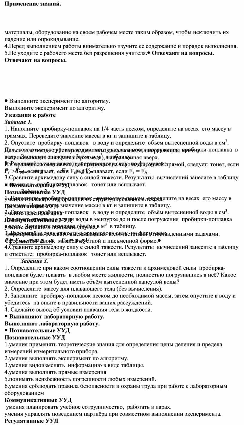 б) для фронтальной работы - Весы с разновесами, измерительный цилиндр (мензурка), пробирка-поплавок с крышкой, сухой песок, нитки, фильтровальная бумага, инструкции по выполнению заданий фронтального эксперимента, тетради для лабораторных работ.
