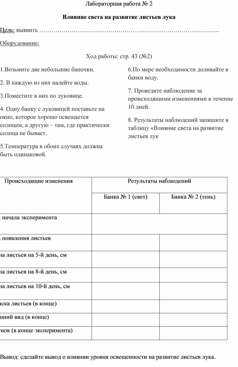 Вывод: сделайте вывод о влиянии уровня освещенности на развитие листьев лука.