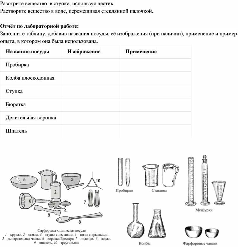 Заполните таблицу, добавив названия посуды, её изображения (при наличии), применение и пример опыта, в котором она была использована.