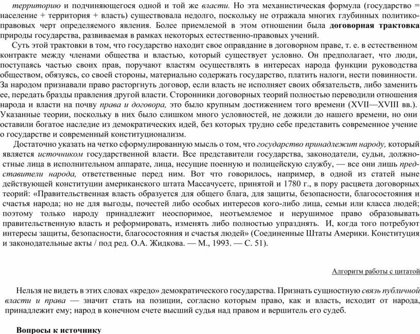 Достаточно указать на четко сформулированную мысль о том, что государство принадлежит народу, который является источником государственной власти. Все представители государства, законодатели, судьи, должностные лица в исполнительном аппарате, лица, несущие поенную и полицейскую службу, — все они лишь представители народа, ответственные перед ним. Вот что говорилось, например, в одной из статей ныне действующей конституции американского штата Массачусетс, принятой и 1780 г., в пору расцвета договорных теорий: «Правительственная власть образуется для общего блага, для защиты, безопасности, благосостояния и счастья народа; но не для выгоды, почестей либо особых интересов кого-либо лица, семьи или класса людей; поэтому только народу принадлежит неоспоримое, неотъемлемое и нерушимое право образовывать правительственную власть и реформировать, изменять либо полностью упразднять. И, когда того потребуют интересы защиты, безопасности, благосостояния и счастья людей» (Соединенные Штаты Америки. Конституция и законодательные акты / под ред. О.А. Жидкова. — М., 1993. — С. 51).