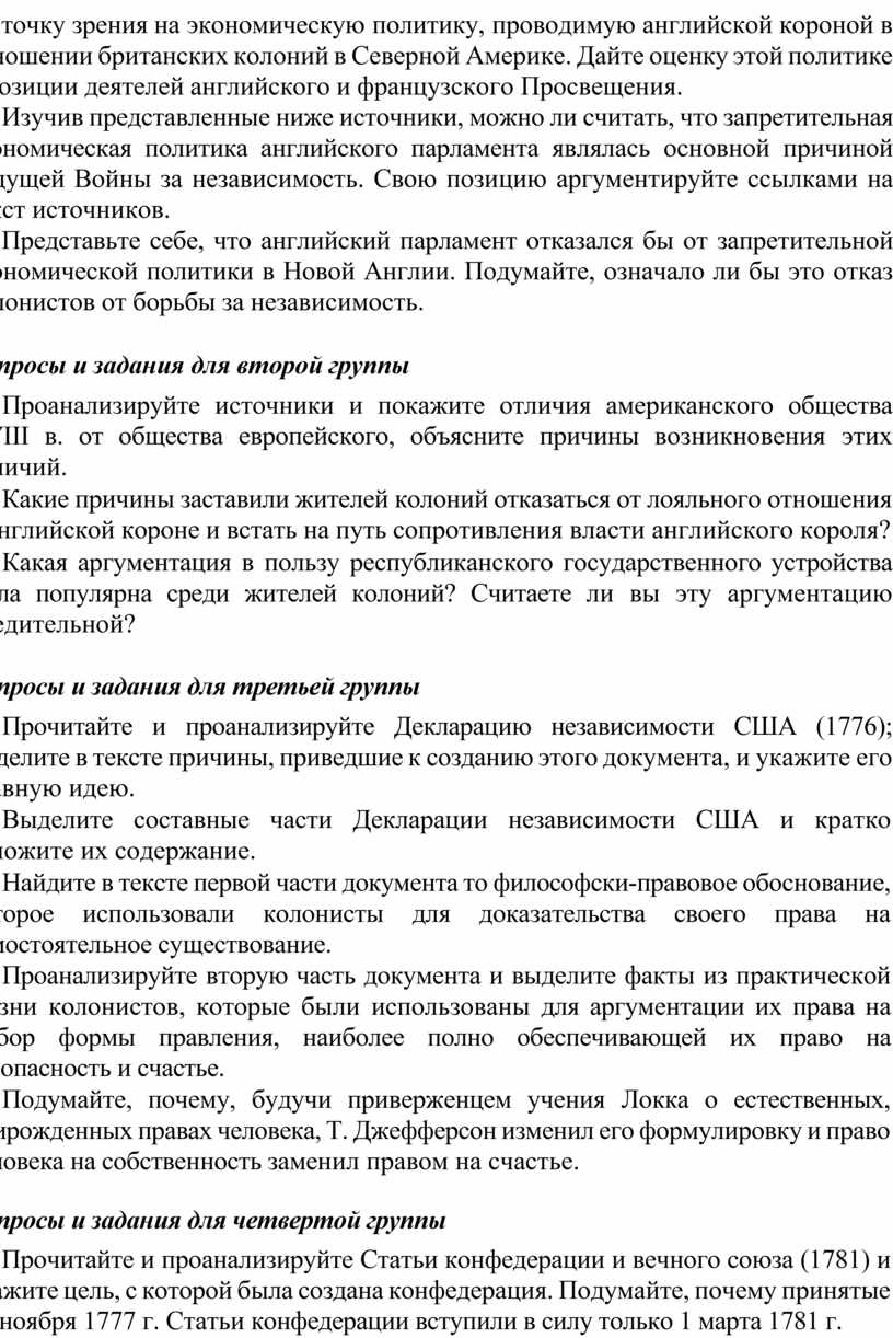 1. Используя приведенные ниже документы и другие источники, выскажите вашу точку зрения на экономическую политику, проводимую английской короной в отношении британских колоний в Северной Америке. Дайте оценку этой политике с позиции деятелей английского и французского Просвещения.