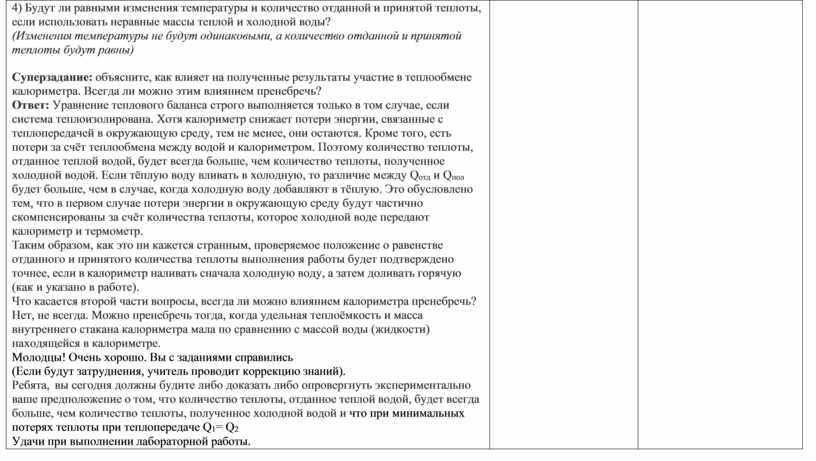 4) Будут ли равными изменения температуры и количество отданной и принятой теплоты, если использовать неравные массы теплой и холодной воды? (Изменения температуры не будут одинаковыми, а количество отданной и принятой теплоты будут равны)