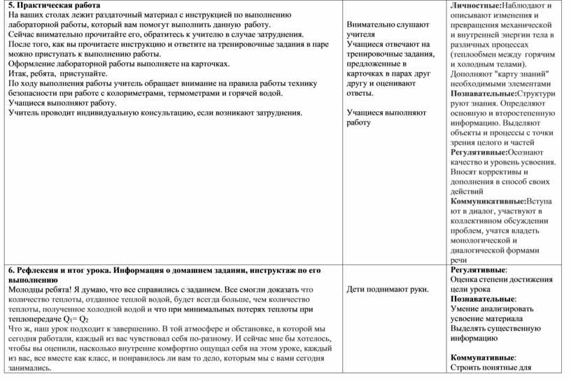 Личностные:Наблюдают и описывают изменения и превращения механической и внутренней энергии тела в различных процессах (теплообмен между горячим и холодным телами). Дополняют "карту знаний" необходимыми элементами Познавательные:Структури руют знания. Определяют основную и второстепенную информацию. Выделяют объекты и процессы с точки зрения целого и частей Регулятивные:Осознают качество и уровень усвоения. Вносят коррективы и дополнения в способ своих действий Коммуникативные:Вступа ют в диалог, участвуют в коллективном обсуждении проблем, учатся владеть монологической и диалогической формами речи |