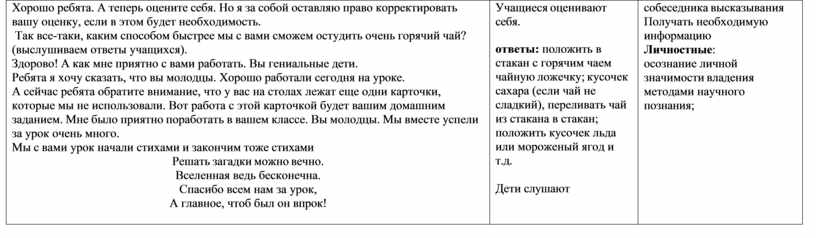 Хорошо ребята. А теперь оцените себя. Но я за собой оставляю право корректировать вашу оценку, если в этом будет необходимость. Так все-таки, каким способом быстрее мы с вами сможем остудить очень горячий чай? (выслушиваем ответы учащихся). Здорово! А как мне приятно с вами работать. Вы гениальные дети. Ребята я хочу сказать, что вы молодцы. Хорошо работали сегодня на уроке. А сейчас ребята обратите внимание, что у вас на столах лежат еще одни карточки, которые мы не использовали. Вот работа с этой карточкой будет вашим домашним заданием. Мне было приятно поработать в вашем классе. Вы молодцы. Мы вместе успели за урок очень много. Мы с вами урок начали стихами и закончим тоже стихами Решать загадки можно вечно. Вселенная ведь бесконечна. Спасибо всем нам за урок, А главное, чтоб был он впрок! |