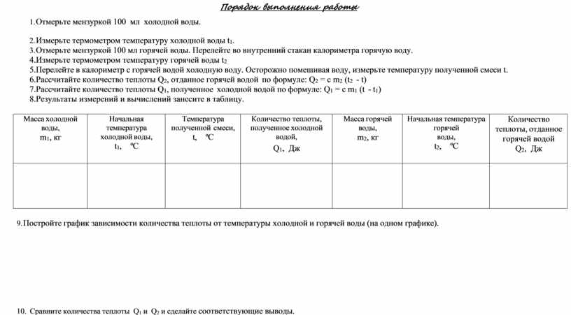 7.Рассчитайте количество теплоты Q1, полученное холодной водой по формуле: Q1 = с m1 (t - t1) 8.Результаты измерений и вычислений занесите в таблицу.